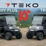 TEKO EV golf carts, such as the 2026 Turbo and Trophy models, are high-performance lithium-ion electric vehicles featuring 5kW AC motors, speeds up to 25 MPH, and roughly 40-mile ranges. Standard features include 10.1” multimedia displays, rearview cameras, LED lighting, premium seats, and fast charging.