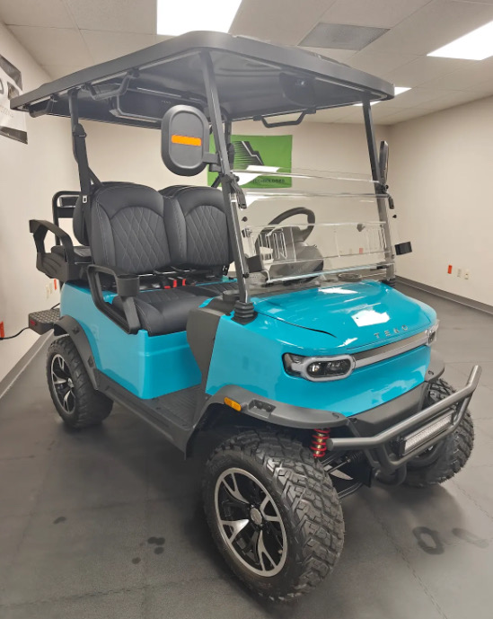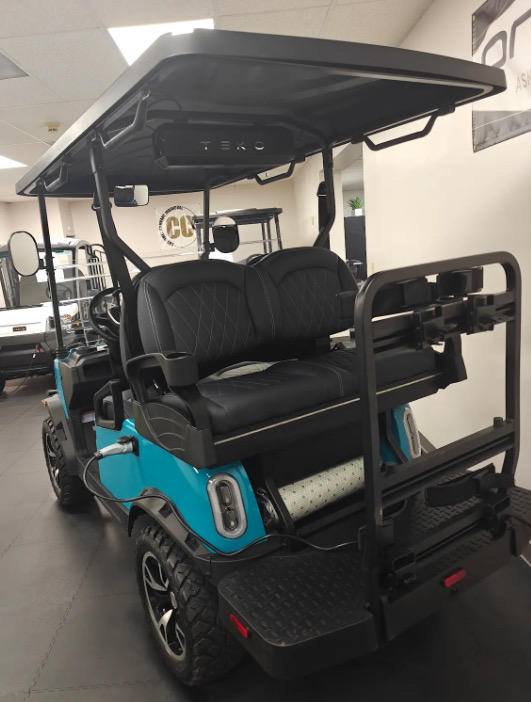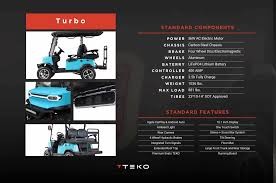 TEKO EV golf carts, such as the 2026 Turbo and Trophy models, are high-performance lithium-ion electric vehicles featuring 5kW AC motors, speeds up to 25 MPH, and roughly 40-mile ranges. Standard features include 10.1” multimedia displays, rearview cameras, LED lighting, premium seats, and fast charging.
