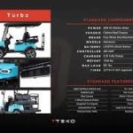 TEKO EV golf carts, such as the 2026 Turbo and Trophy models, are high-performance lithium-ion electric vehicles featuring 5kW AC motors, speeds up to 25 MPH, and roughly 40-mile ranges. Standard features include 10.1” multimedia displays, rearview cameras, LED lighting, premium seats, and fast charging.