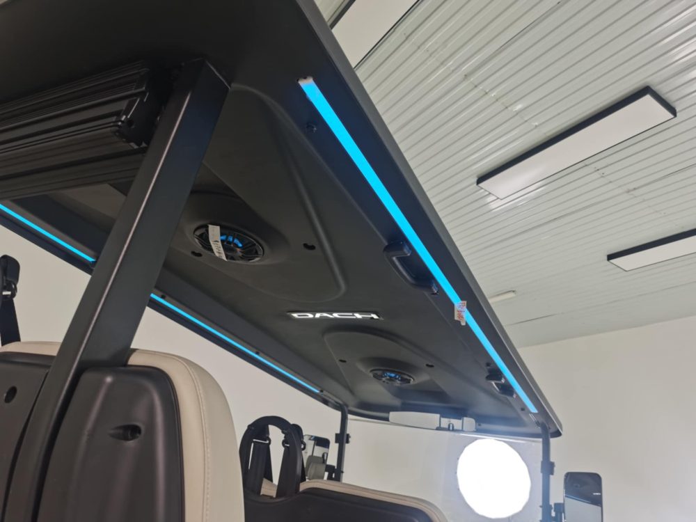- CUSTOM ENTERTAINMENT TOP TO INCLUDE: REAR LIGHTED SOUNDBAR, INTEGRATED DUAL 6.5 ” LIGHT UP SPEAKERS , ROOF LED LIGHTS, HIGH-MOUNT BRAKE LIGHT, & ROOF LOGO LIGHT
