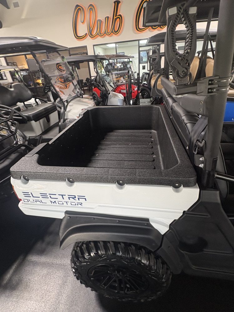 The Electra™ comes standard with 14” aluminum wheels, 26” tires, and a white carbon fiber polymer body. The Electra™ is available in other solid colors as a standard option and Realtree™ Camouflage is available as an upgrade. The Electra™ has a vehicle capacity of 1,500 lbs. and just like all HuntVe™ vehicles, the Electra™ comes with 4 wheel independent smooth ride suspension, 4 wheel hydraulic brakes, power dump bed, full time 4WD, and more.
