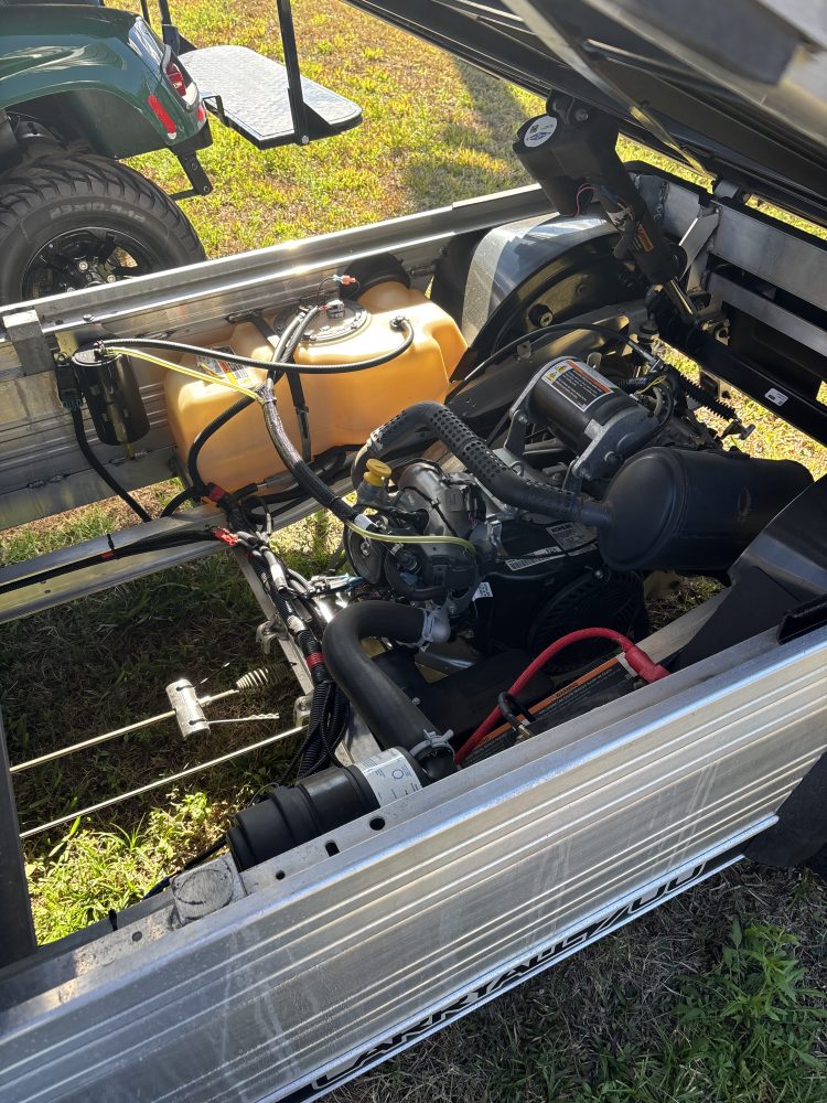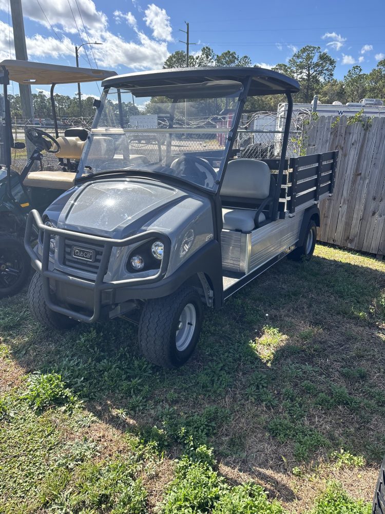 USED 2024 CLUB CAR CARRYALL 700 GAS WITH STAKESIDE KIT, LIGHTS, TOP, BRUSH GUARD AND WINDSHIELD